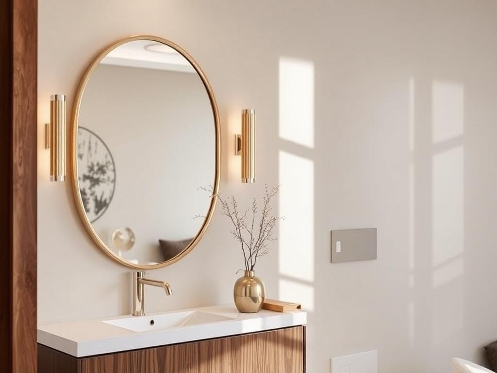 - Форма: крупное прямоугольное зеркало визуально удлиняет стены, круглое добавляет мягкость и фокус внимания, овальное сочетает оба качества.