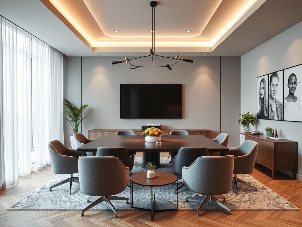Чтобы встреча проходила без задержек, продумайте хранение и доступ к технике. Встроенные полки, выдвижные ящики под диваном, скрытые подставки под напитки и кабель-каналы помогут держать комнату аккуратной. Размещайте технику так, чтобы экран был виден всем участникам, а провода — незаметны.